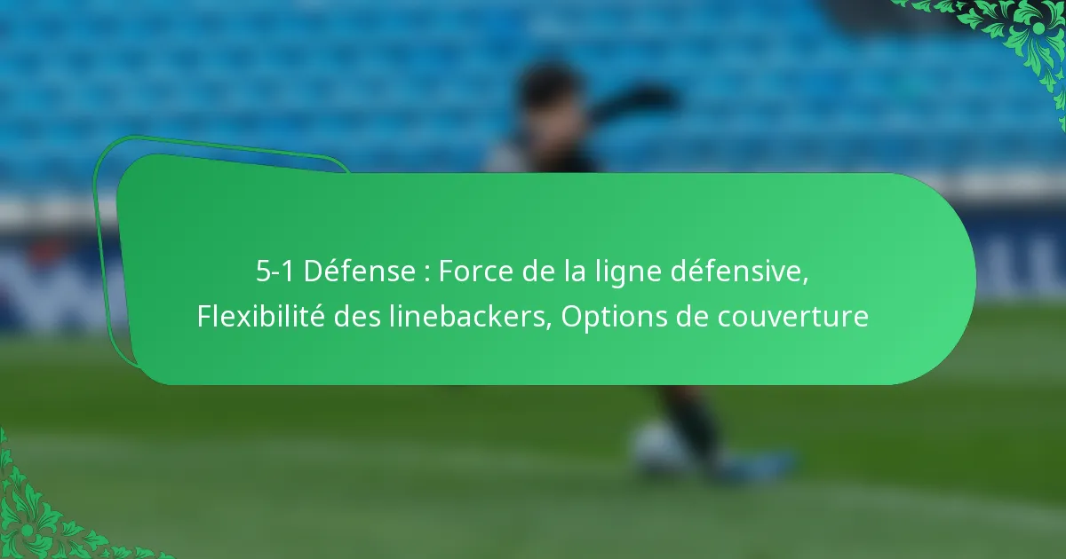 La défense 5-1 est une formation stratégique de football qui met l’accent sur une ligne défensive solide composée de cinq joueurs de ligne et d’un linebacker. Cette configuration renforce non seulement la ligne contre les jeux offensifs, mais offre également de la flexibilité pour les linebackers et des options de couverture, en faisant un choix polyvalent pour contrer les attaques de course et de passe. La force de la ligne défensive est essentielle pour contrôler le jeu, tandis que l’adaptabilité des linebackers améliore l’efficacité globale de la défense.